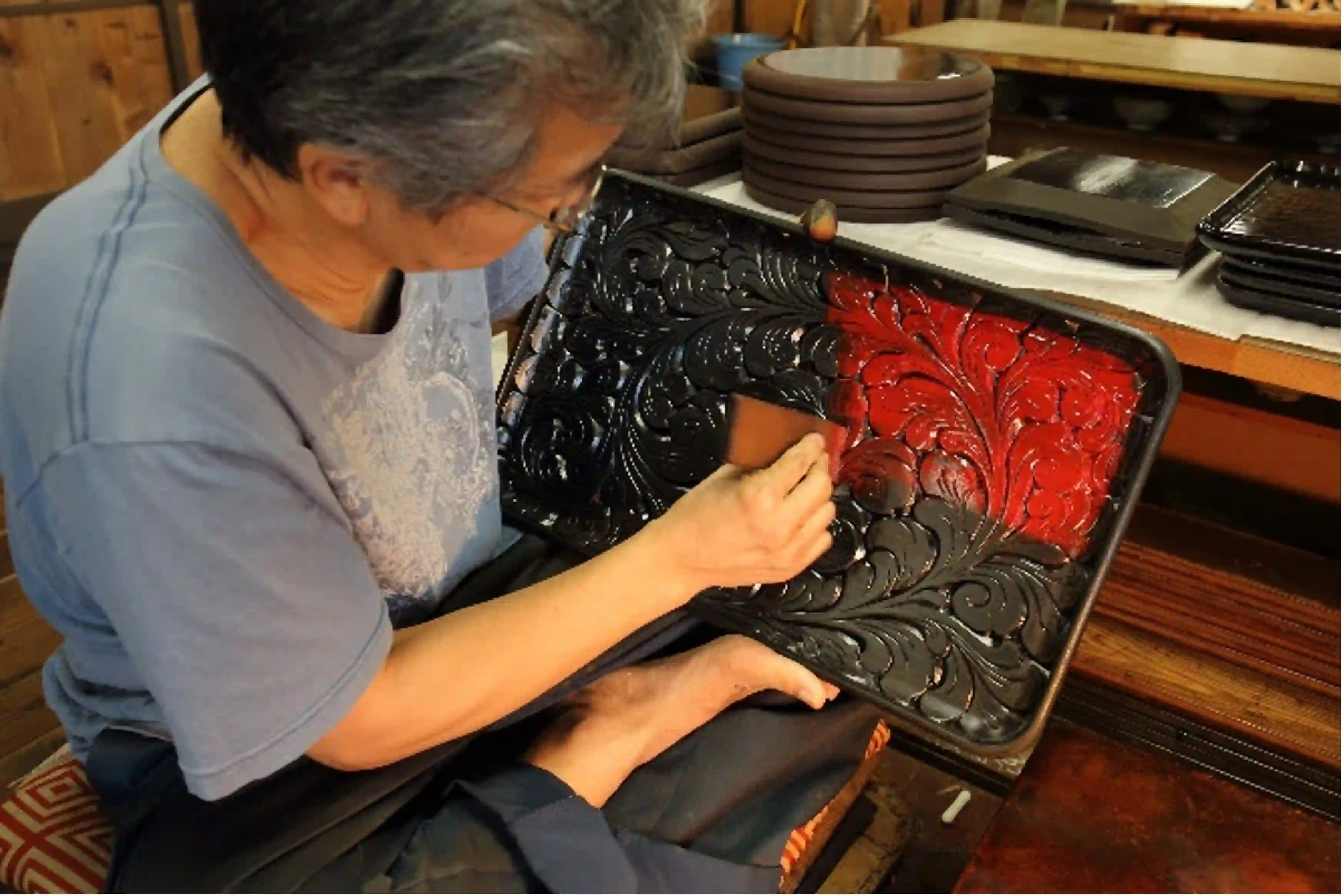 Hakkodo, which has inherited a tradition spanning 800 years and has been loved by celebrities in Japan and abroad, has skilled craftsmen who can provide custom-made, original pieces tailored to the needs of each individual customer. Based on a design by the chief of Hakkodo, a wood-base maker craftsperson creates the basic wooden base, a carver adds engraving, and then passes them to the lacquerer to finish them. It takes more than 10 years to become a full-fledged craftsperson.