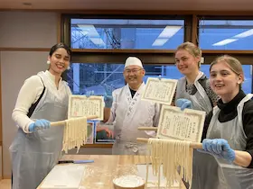 手工制作乌冬面体验 我们是一家90多年来一直追求面条美味的公司,有三代父母和孩子 “睡觉或醒来,乌冬面”。为了生产比其他任何地方都更美味的赞岐乌冬面,我们使用传统的制造方法 “足部富美制造方法”,即工匠们不遗余力地用自己的脚踩在每张纸上拉伸已确认的面团,并使用 “刀切法” 制作横截面为方形、弹性强、边缘锋利的面条。 香川 MORE