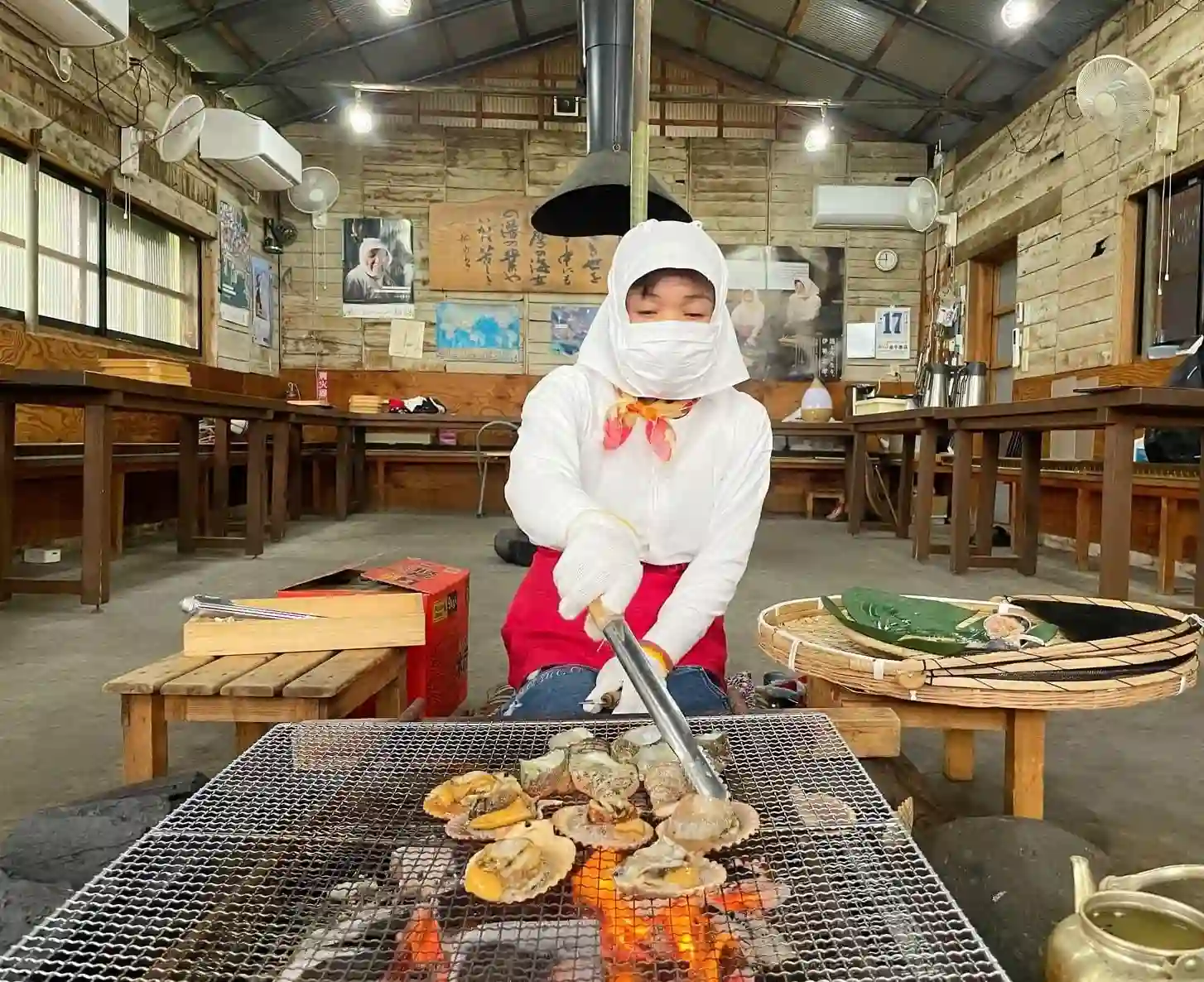 海女小屋とは、海女漁の後に海女さんが冷えた体を囲炉裏で囲んで温めたり休憩する場所で、そこで直接海女さんの話を聞きながら、焼き立ての新鮮な魚介類を堪能できる体験です。食事後は、海女さんの磯着を着て記念撮影ができたり、海女さんと一緒に地元の「相差音頭」を踊ったり海女文化に浸ることができます。